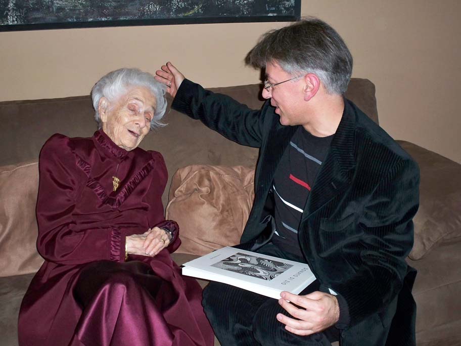 Rita Levi-Montalcini e Donato Di Zio con il catalogo della mostra personale a cura di Gillo Dorfles,